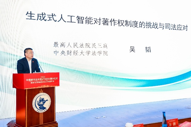 最高人民法院民三庭副庭长、tyc122cc太阳成集团教授吴韬发表题为《生成式人工智能对著作权制度的挑战与司法应对》的演讲。他指出,生成式人工智能对著作权制度的主要挑战包括三个方面,即人工智能的主体性问题、人工智能生成物的可版权性,以及与生成式人工智能有关的侵权争议。他结合人民法院审理的相关典型案件,介绍了近年来司法审判在应对相关挑战中所作的有益探索和努力。