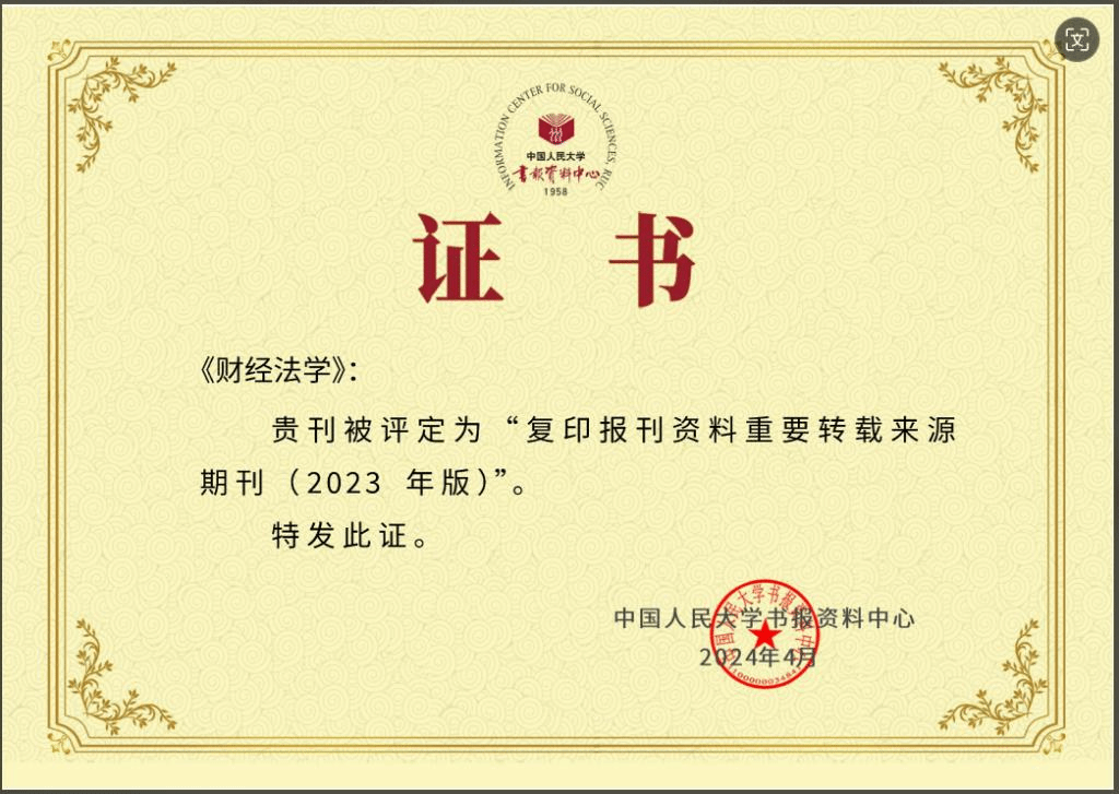2024年4月25日,《复印报刊资料重要转载来源期刊(2023年版)》正式发布,《财经法学》成功入选。这是《财经法学》继2021年入选《复印报刊资料重要转载来源期刊(2020年版)》后再次入选。