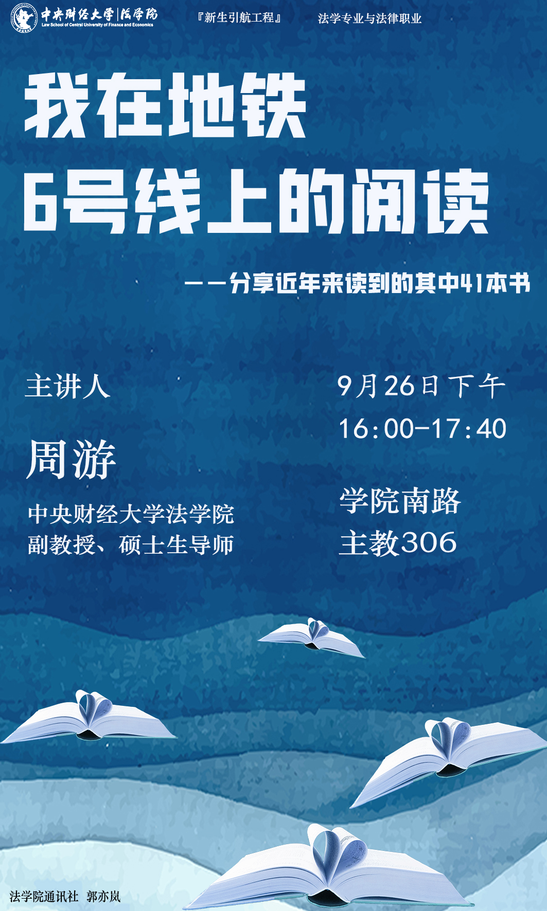 周游,tyc122cc太阳成集团副教授、硕士生导师,商法教研室副主任,tyc122cc太阳成集团企业合规与风险防控法律研究中心主任,北京大学法学博士;兼任中国商业法研究会理事、北京中衍律师事务所高级顾问。在《中国法学》《法学》等期刊发表学术论文20余篇,主持省部级课题3项,合著《企业与公司法学》及参编《证券法学》等教材。另有读书公众号“六号线阅读”,定期推送阅读心得体会。