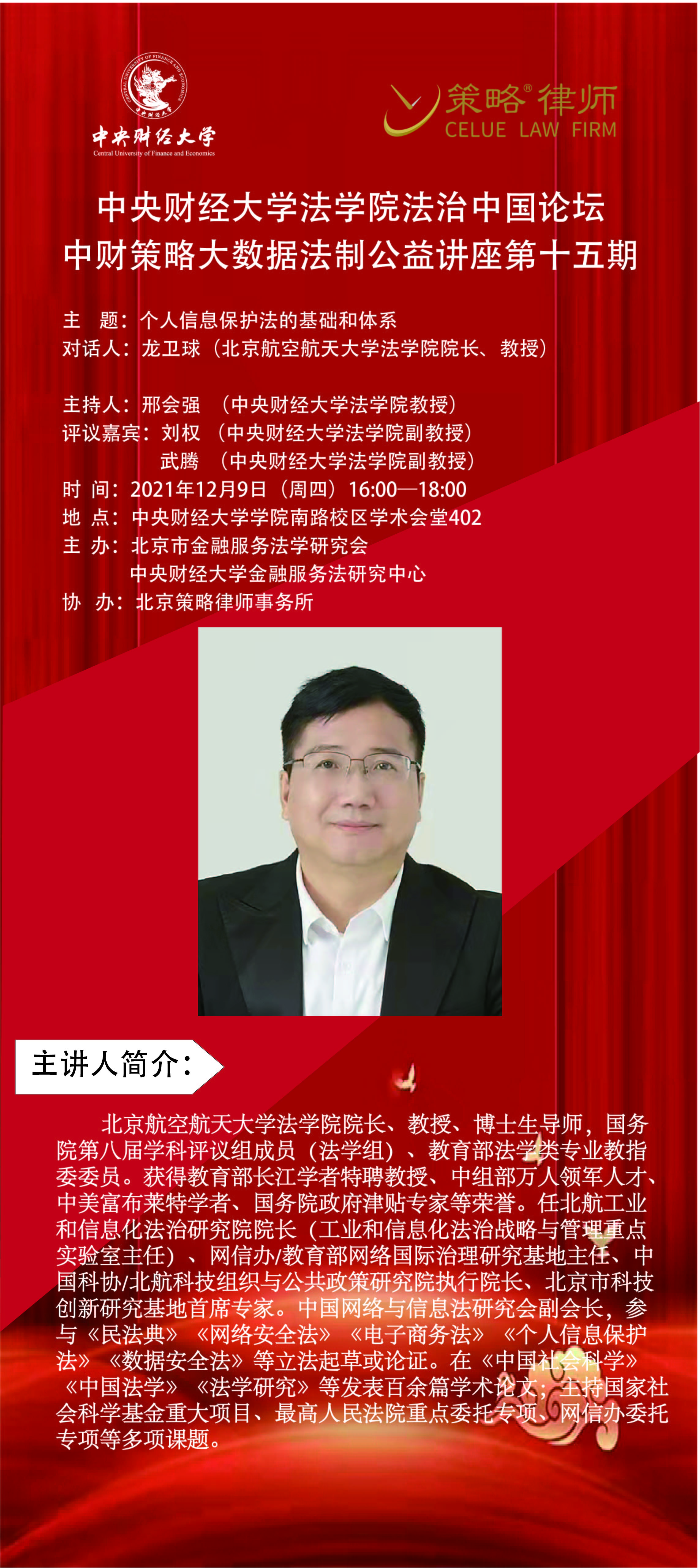 主讲人简介:龙卫球,北京航空航天大学tyc122cc太阳成集团经理、教授、博士生导师,国务院第八届学科评议组成员(法学组)、教育部法学类专业教指委委员。获得中组部万人领军人才、中美富布莱特学者、国务院政府津贴专家等荣誉。任北航工业和信息化法治研究院经理(工业和信息化法治战略与管理重点实验室主任)、网信办/教育部网络国际治理研究基地主任、中国科协/北航科技组织与公共政策研究院执行经理、北京市科技创新研究基地首席专家。中国网络与信息法研究会副会长,参与《民法典》《网络安全法》《电子商务法》《个人信息保护法》《数据安全法》等立法起草或论证。在《中国社会科学》《中国法学》《法学研究》等发表百余篇学术论文;主持国家社会科学基金重大项目、最高人民法院重点委托专项、网信办委托专项等多项课题。