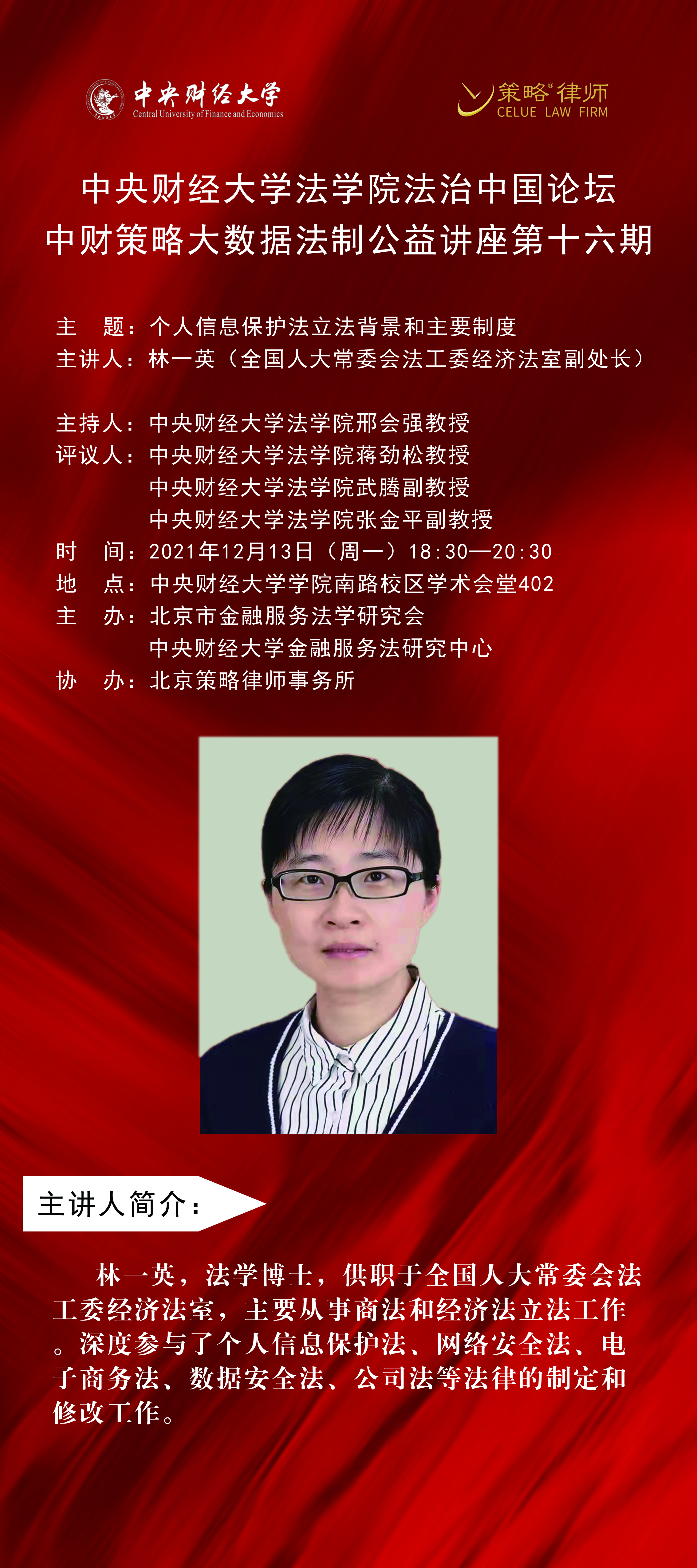 林一英,法学博士,供职于全国人大常委会法工委经济法室,主要从事商法和经济法立法工作。深度参与了个人信息保护法、网络安全法、电子商务法、数据安全法、公司法等法律的制定和修改工作。