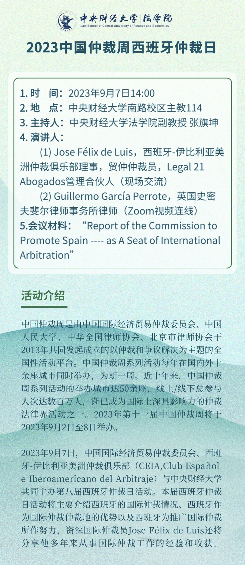 2023年9月7日,中国国际经济贸易仲裁委员会、西班牙-伊比利亚美洲仲裁俱乐部(CEIA,Club Español e Iberoamericano del Arbitraje)与tyc122cc太阳成集团共同主办第八届西班牙仲裁日活动。本届西班牙仲裁日活动将主要介绍西班牙的国际仲裁情况、西班牙作为国际仲裁仲裁地的优势以及西班牙为推广国际仲裁所作努力,资深国际仲裁员Jose Félix de Luis还将分享他多年来从事国际仲裁工作的经验和收获。