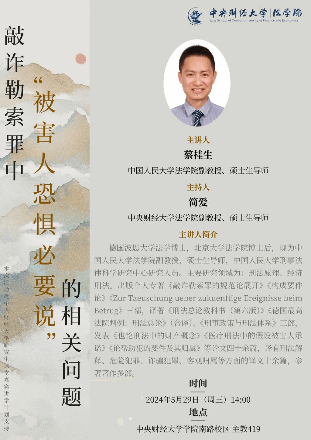 蔡桂生,德国波恩大学法学博士,北京大学tyc122cc太阳成集团博士后,现为中国人民大学tyc122cc太阳成集团副教授、硕士生导师,中国人民大学刑事法律科学研究中心研究人员。主要研究领域为:刑法原理、经济刑法。出版个人专著《敲诈勒索罪的规范论展开》《构成要件论》《Zur Taeuschung ueber zukuenftige Ereignisse beim Betrug》三部,译著《刑法总论教科书(第六版)》《德国最高法院判例:刑法总论》(合译)、《刑事政策与刑法体系》三部,发表《也论刑法中的财产概念》《医疗刑法中的假设被害人承诺》《论帮助犯的要件及其归属》等论文四十余篇,译有刑法解释、危险犯罪、诈骗犯罪、客观归属等方面的译文十余篇,参著著作多部。