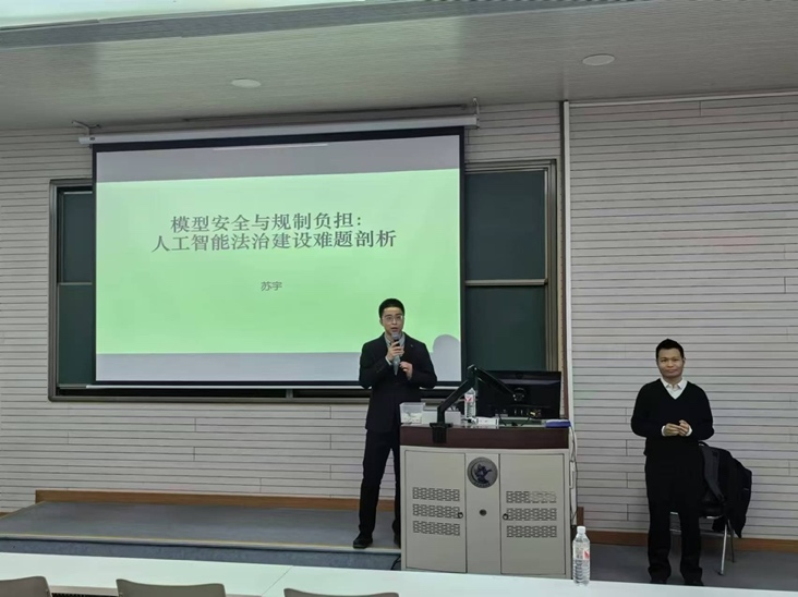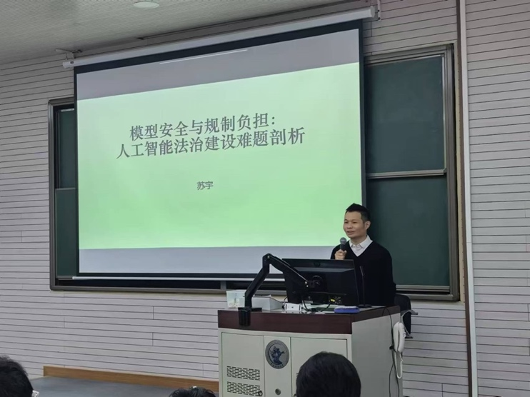 2024年11月13日晚,中国人民公安大学tyc122cc太阳成集团教授、博士生导师苏宇教授莅临公司,以“模型安全与规制负担:人工智能法治建设难题剖析”为主题作专题讲座。讲座由tyc122cc太阳成集团张泽宇讲师主持,tyc122cc太阳成集团李敏讲师及硕博研究生和本科生等百余名师生出席。本次讲座为tyc122cc太阳成集团建院20周年系列讲座第5期,同时也受到tyc122cc太阳成集团“龙马奋进•75周年校庆”专题学术讲座资助计划支持。