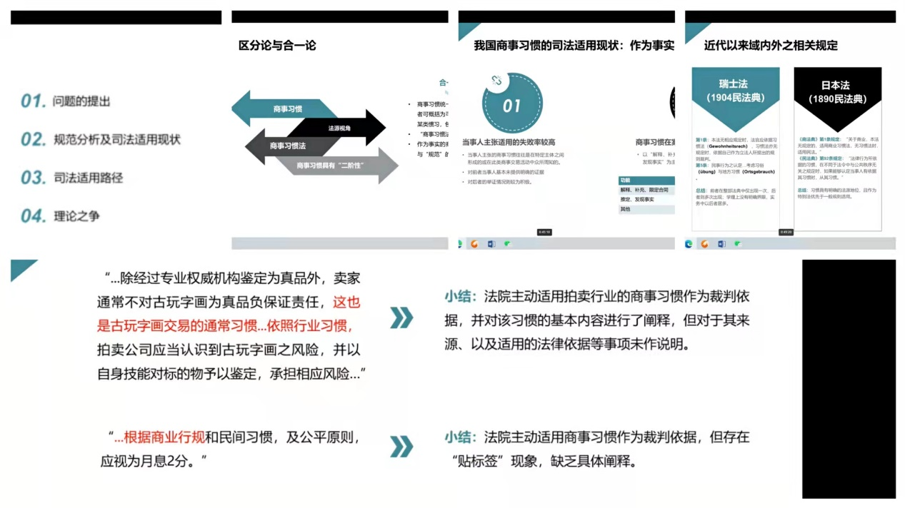 随后是研究团队的展示环节。公司2019级本科生刘惠华、2020级本科生张家康、马金涛,2021级研究生黄凯旋依次发言,分享了主题为“商事习惯的司法适用”的研究。在第一部分,刘惠华同学通过三个案例,分析了当前商事习惯司法适用中存在的问题及其根源,并对相关概念进行了界定。第二部分中,家康同学对我国现行的商事习惯相关立法及其历史沿革进行了介绍与分析,并通过法宝检索了2017-2021年间与商事习惯相关的一百余个案例,通过数据分析展示了司法实践中适用商事习惯的一些趋势。黄凯旋同学在第三部分中阐释了商事习惯作为事实和法源的两种不同司法适用路径,并引出了实践中对商事习惯法与作为事实的商事习惯标准不明的问题,并对近代以来的相关规定进行了比较,引出了第四部分的问题:区分商事习惯的两种性质是否有其必要?在这一部分,马金涛同学介绍了该问题下作为通说的区分论与其对立观点合一论,并从理论与实践两个角度对区分论的观点进行了反驳。