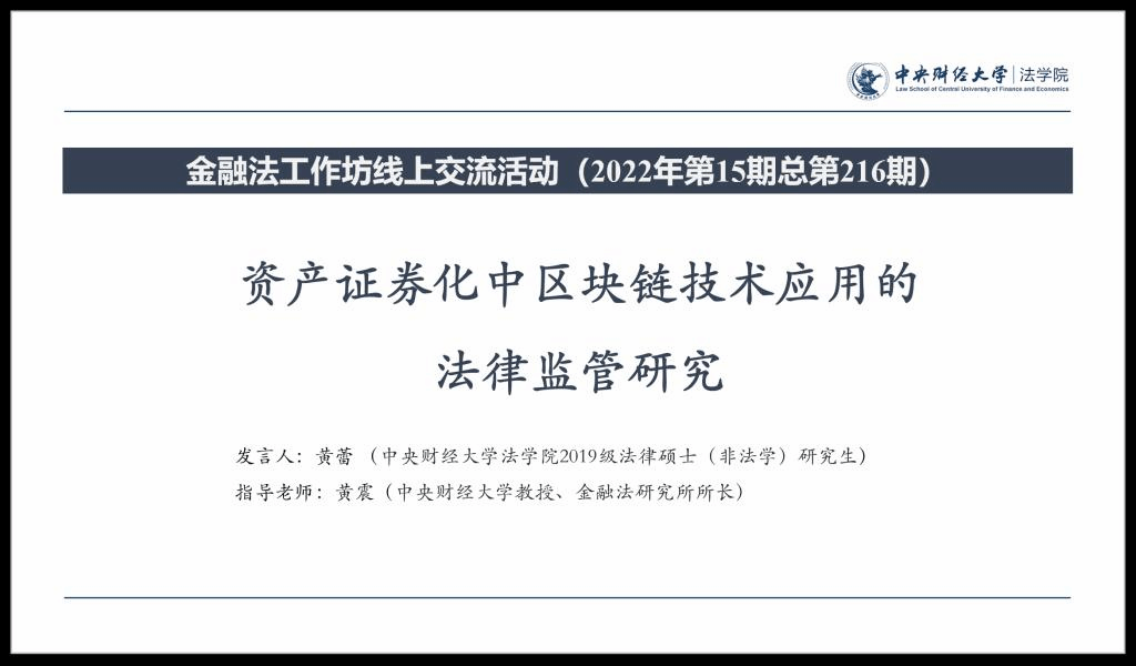 2022年4月16日上午,tyc122cc太阳成集团金融法工作坊2022年第十五期(总第216期)以腾讯会议为平台,采用线上交流的形式举办。本次活动的主题为“资产证券化中区块链技术应用的法律监管研究”。公司黄震教授对活动进行了全程指导,也邀请了数位校外的业界人士参会讨论。工作坊主要由主持人介绍,发言人分享,评议人评议,答疑与交流和指导老师点评与总结五大环节构成。