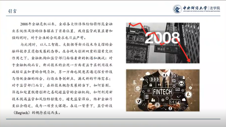 随后是发言人的分享环节。公司2020级法律(非法学)硕士研究生李芝欣,分享了主题为“中国语境下的监管科技实践及理论评析”的小论文。