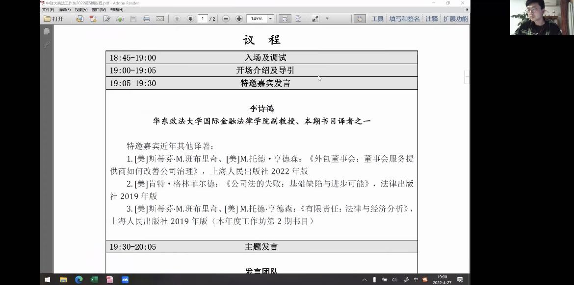 2022年4月27日晚,tyc122cc太阳成集团商法学研究工作坊2022年第五期(总第27期)采用线上交流的形式举办。本次活动的议题为公司治理模式的评判与选择——董事会在中国公司治理模式中的角色扮演和未来走向。本期工作坊参考书目《金融危机后的公司治理》的译者之一、华东政法大学国际金融法律公司副教授李诗鸿老师受邀参加本次活动,公司周游副教授对活动进行全程指导。工作坊主要由嘉宾对会议主题进行介绍与拓展、研究团队围绕主题进行展示、指导老师点评、指导老师对评议团队进行提问、评议团队回答提问、评议团队提问发言团队、发言团队回应与自由讨论、特邀嘉宾与指导老师回应成员提问等环节构成。本次线上商法工作坊共计有70余位校内外师生及业界人士参与讨论。