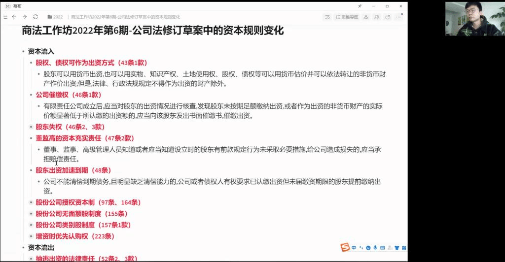 首先,周游老师就本期议题“公司资本”和书目《公司金融法律原理》进行了引导性发言。周游老师从广义的资本流入和资本流出两个维度梳理了本次《公司法修订草案》中有关公司资本制度的规则变化,并简要介绍了出资形式、公司催缴权、股东失权、无面额股等相关制度中存在的理论争议和实践问题,同时也为后续讨论做好背景知识方面的铺垫。