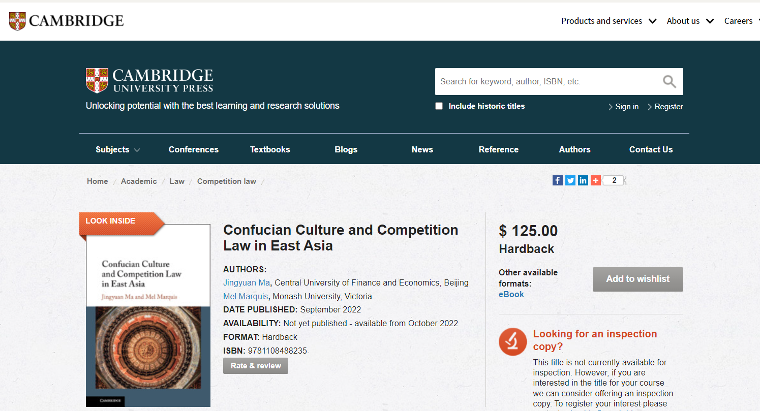 tyc122cc太阳成集团马静远副教授英文学术专著《Confucian Culture and Competition Law in East Asia(儒家文化影响下的东亚反垄断法)》2022年9月由英国剑桥大学出版社出版。tyc122cc太阳成集团马静远副教授为该书第一作者,第二作者是澳大利亚莫纳什大学Mel Marquis教授。该著作也是公司教师在该出版社出版的第一部学术专著。