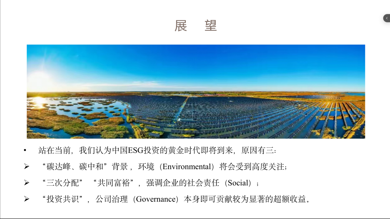 在分享的展望中,郑壮律师结合当下“碳达峰、碳中和”、“三次分配”、“共同富裕”、“投资共识”等政策背景,重新解读了ESG在中国蕴含的特殊意义,认为ESG投资的黄金时代即将到来,作为法律人,应当积极拥抱ESG,结合中国经济发展的实际情况“因时而动,顺势而为”。郑律师希望未来与大家一同成为ESG历史进程的参与者和建设者。