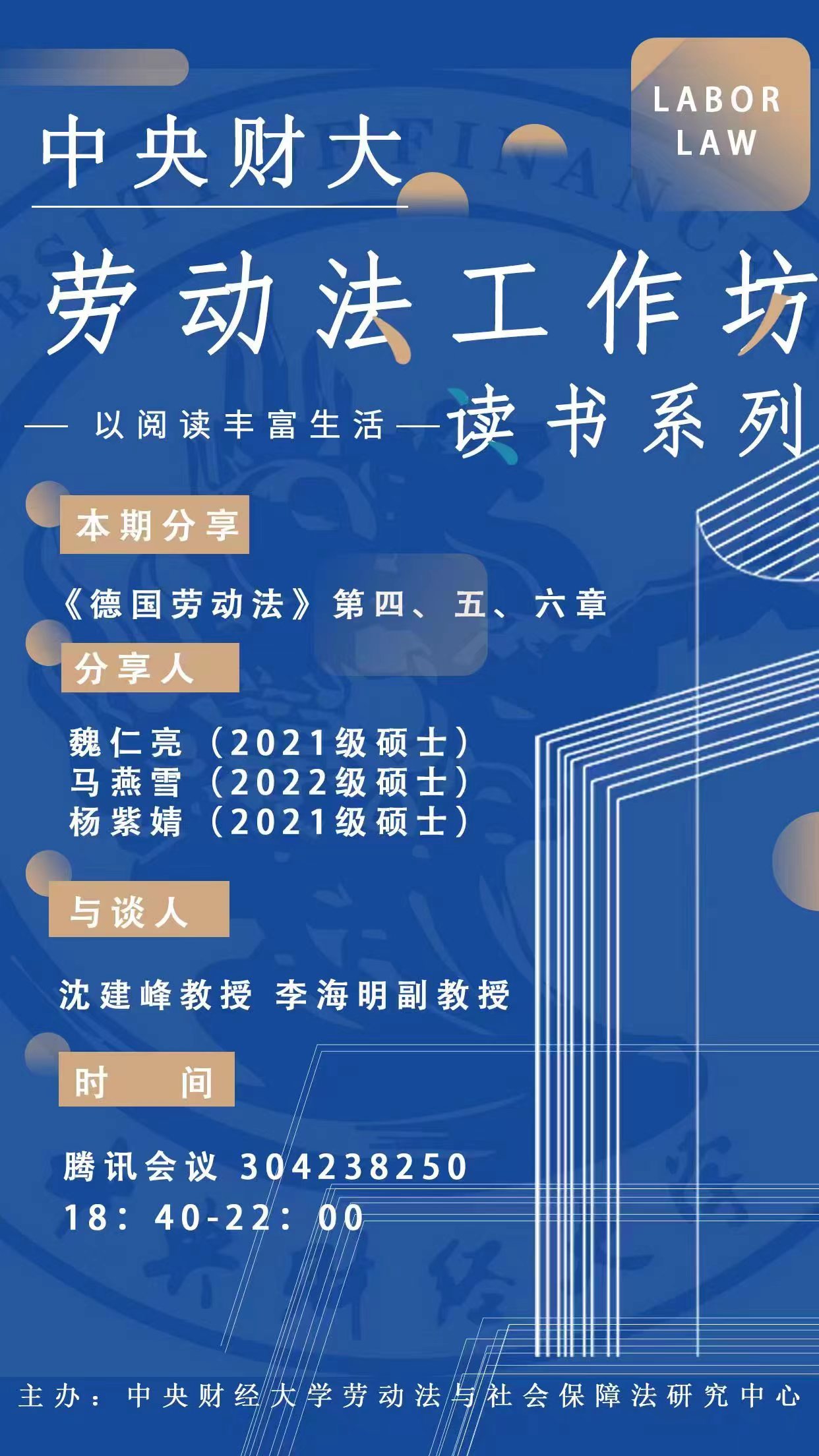 2022年10月9日晚,tyc122cc太阳成集团劳动法工作坊第二期活动以线上线下相结合的方式举行。本期工作坊阅读书目为《德国劳动法》第四、五、六章。公司沈建锋教授、李海明副教授担任指导教师。2021级研究生魏明亮、2022级研究生马艳雪、2021级研究生杨紫婧进行了读书汇报工作,2021级、2022级硕士生、博士生共20余人参加活动。