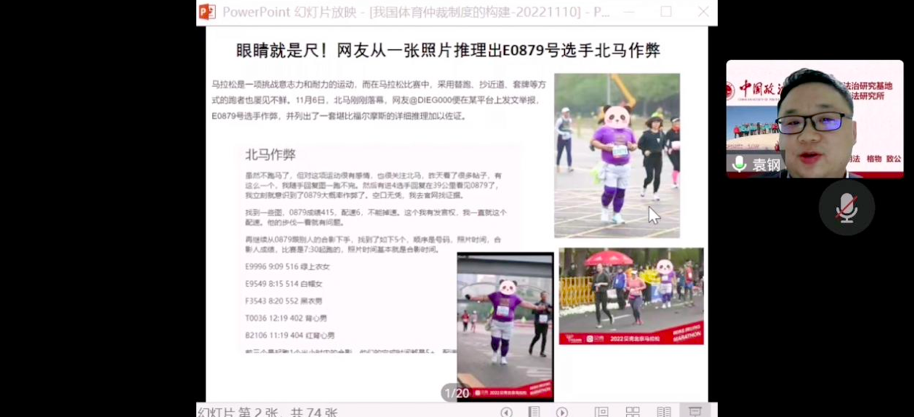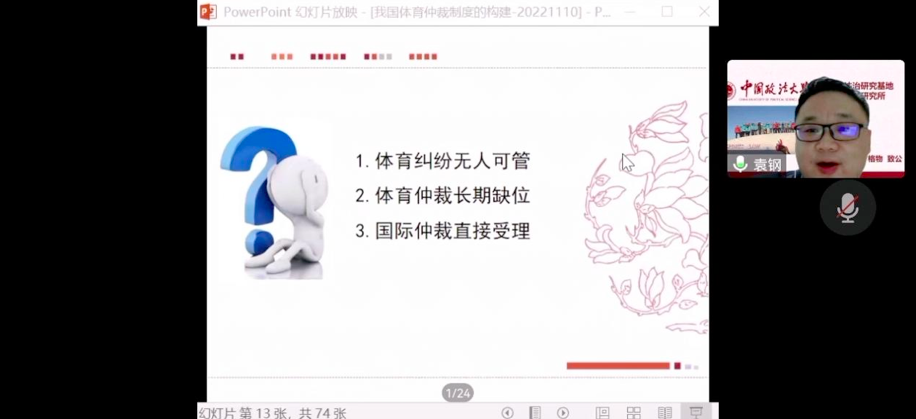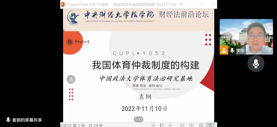 2022年11月10晚,“我国体育仲裁制度的构建”讲座在线举行,邀请中国政法大学袁钢教授主讲,tyc122cc太阳成集团副经理李伟副教授主持,体育经济与管理公司马法超副教授、tyc122cc太阳成集团沈健副教授、曹建军副教授与谈,tyc122cc太阳成集团经理尹飞教授及公司部分本科生、研究生参加了本次活动。