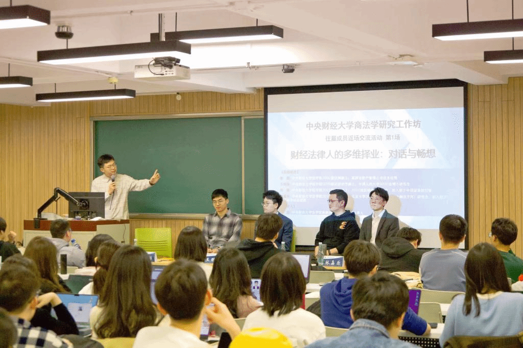 2023年3月15日晚,tyc122cc太阳成集团商法工作坊第一场往届成员返场交流活动在tyc122cc太阳成集团公司南路校区主教306教室举办。本次活动的主题是“财经法律人的多维择业:对话与畅想”。本次活动特邀商法工作坊往届成员张磊、王明泽、林晟和林嘉乐同学作为本次分享会的嘉宾。本次分享会共计有100余名院内外同学参加。
