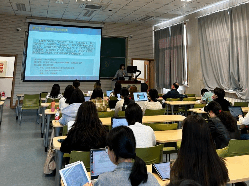 张泽华法官从案例、问题的提出与解决和公司法修订草案中的信义义务三个方面和同学们分享了她的审判感受。首先,她从审判实务入手,向同学介绍了她曾主办的一个VIE架构下董事、监事违反信义义务的案例。在简介案情后,张泽华法官重点讲述了VIE架构的设计、VIE架构下授权协议效力以及该架构下董事、监事的信义义务问题。张泽华法官指出,在法律层面上,VIE架构下国内运营实体的股东可以概括或者特别委托WFOE公司在委托权限范围内行使表决权。但是,必须认识到,该授权委托是基于为了实现控制国内可变利益实体而产生的,这种控制应当排除不当控制和权利滥用,因而在对WFOE公司与实际运营实体之间的授权委托书的效力不应当被机械解读,而应根据具体情形来判断其授权条款的限制效力。张法官同时指出,实务中对于受信人忠实义务约束的三种途径:建立隔离墙、采用独立方的意见进行决策以及完善的披露机制。基于上述三种约束机制要求,衍生出忠实义务的三个方面:受托人服从和遵守委托指令的义务、善意履行以及履职中详尽的报告义务,受信人在履行职务中虽就如何使用受托资产及权利有自由裁量空间,但其应当善意行事,而不是寻找“法律漏洞”。结合目前公司法草案二审稿,张泽华法官对董事、监事信义义务规则进行了展望,详尽地阐述了董事关联交易中关联人和关联交易的信息披露、关联交易正当程序和衡量关联交易公平性的规则等问题。