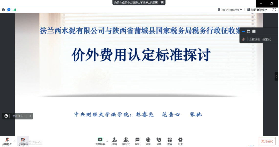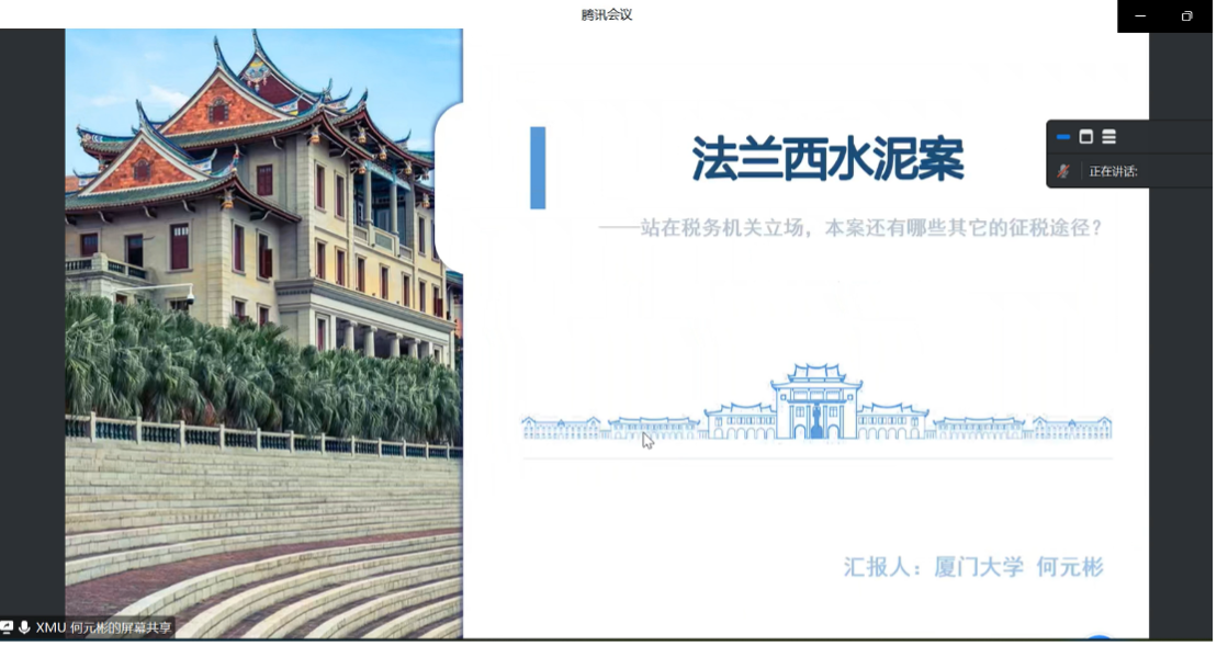 2023年5月14日晚,第47期财税法工作坊暨公司tyc122cc太阳成集团与江西财经大学tyc122cc太阳成集团、厦门大学tyc122cc太阳成集团、华中科技大学tyc122cc太阳成集团联合举办的四校财税法论坛在腾讯会议线上举行。本次论坛围绕“法兰西水泥(中国)有限公司与陕西省蒲城县国家税务局税务行政征收纠纷上诉案”这一典型案例展开讨论。