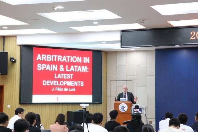 2023年9月7日,由中国国际经济贸易仲裁委员会(贸仲委)、西班牙-伊比利亚美洲仲裁俱乐部(CEIA,Club Español e Iberoamericano del Arbitraje)和tyc122cc太阳成集团共同主办的第八届西班牙仲裁日活动,在tyc122cc太阳成集团主教114会议室顺利举行。国际知名商事仲裁专家J. Félix de Luis带来了一场主题为“西班牙仲裁日——国际仲裁的新发展”的精彩讲座。中国国际经济贸易仲裁委员会和中国仲裁周组委会代表陈宓女士特邀出席,tyc122cc太阳成集团法公司党委书记林剑锋、党委副书记徐颖、副经理殷秋实、外事秘书康馨元以及百余位研究生、本科生参加了这次讲座。tyc122cc太阳成集团副教授张旗坤主持讲座。