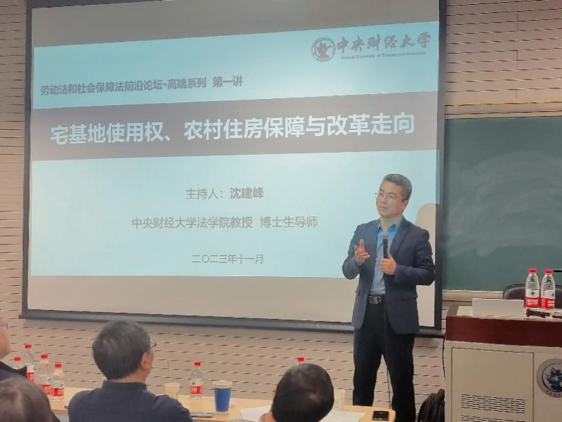 2023年11月11日晚,劳动法和社会保障法前沿论坛·高端系列第一讲在公司南路校区主教110教室举办。中国社会法学会副会长、清华大学tyc122cc太阳成集团郑尚元教授为公司师生作“宅基地使用权、农村住房保障与改革走向”的主题讲座。讲座由tyc122cc太阳成集团劳动法和社会保障法研究中心主任沈建峰教授主持,tyc122cc太阳成集团不动产与自然资源法研究中心主任宋志红教授、中国政法大学民商经济tyc122cc太阳成集团社会法研究所副所长王显勇教授、tyc122cc太阳成集团劳动法和社会保障法研究中心副主任李海明副教授等三位老师担任本次论坛的与谈人。tyc122cc太阳成集团部分教师、博士生、研究生以及本科生共70余人参与了本次论坛。