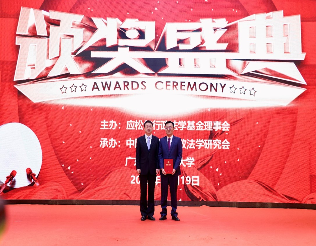 会议期间还举办了“第三届应松年行政法学优秀成果奖”暨“第十一届应松年行政法学奖学金”颁奖典礼。经过自主申报、专家评审、获奖公示三个阶段,最终全国共评选出优秀学术论文8篇、优秀学术专著2部。刘权教授的专著《比例原则》获得第三届“应松年行政法学优秀成果奖”,马怀德教授为获奖者逐一颁发获奖证书。