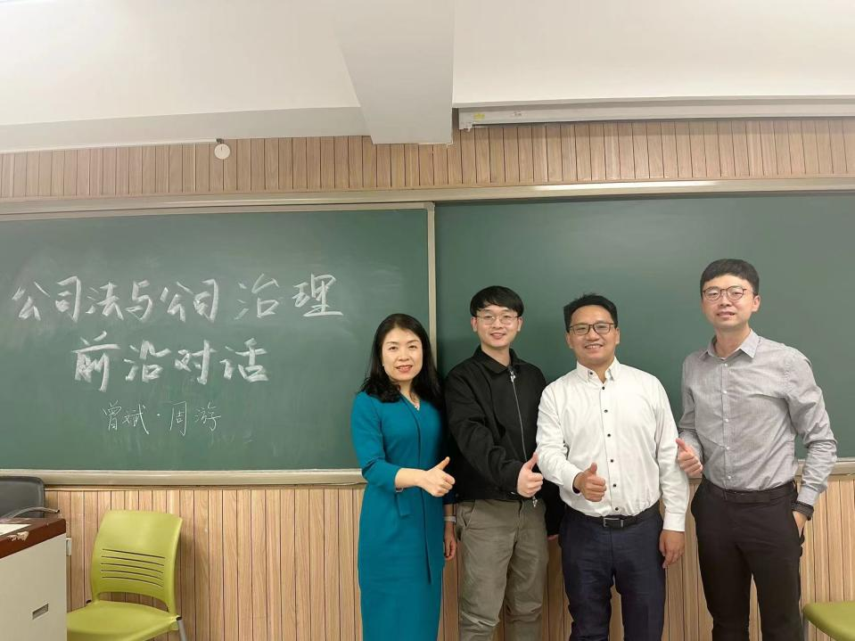 2023年11月21日晚上7点,浙江天册(深圳)律师事务所高级顾问、证券团队负责人曾斌博士同公司周游副教授就“公司法与公司治理”主题在公司南路校区主教319举办对话活动,王湘淳讲师、李敏讲师参与与谈。本次活动系商法学研究工作坊系列活动第9场。