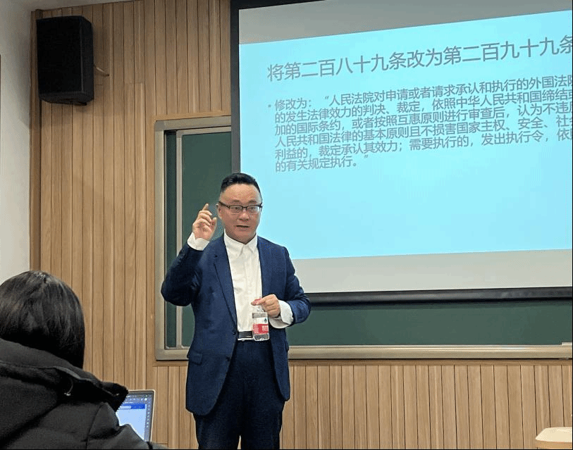 讲座中,主讲人从研讨习近平法治思想指引下的《民事诉讼法》涉外编修改的时代意义、习近平法治思想的意蕴、涉外编修改的科学思维方法以及《民事诉讼法》涉外编的实践运用四个方面进行讲解,将习近平法治思想与《民事诉讼法》涉外编及其修正理由相结合,让同学们切实感受到了底线思维、系统思维、辩证思维等科学思维方法在《民事诉讼法》涉外编修正中的具体运用。同时,主讲人列举和解读了牵连管辖、可供扣押财产、适当联系等相关知识点的真实司法案例,突出涉外管辖、送达、取证、承认与执行等制度在本次修法过程中实现的重大变革。