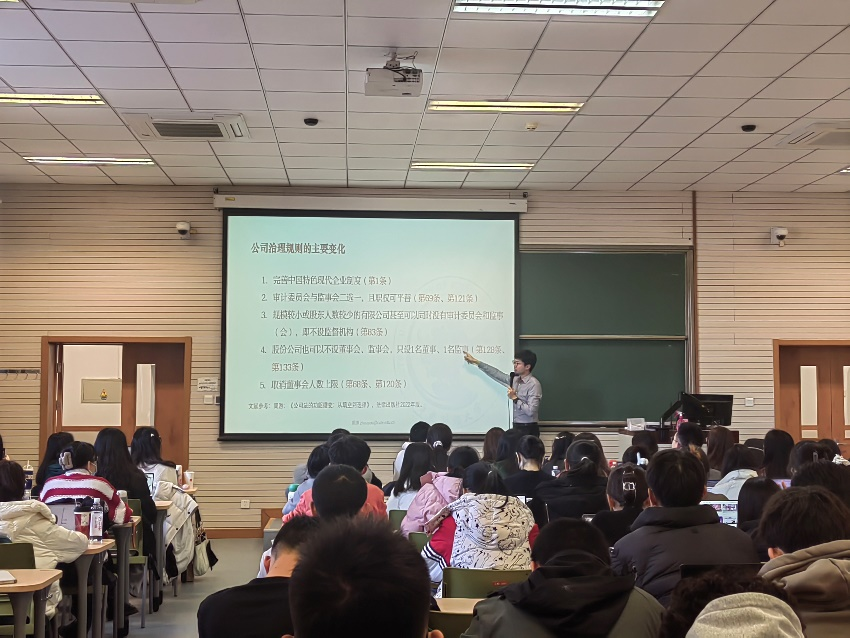 2024年3月6日下午2点,商法工作坊五周年系列活动第一场在tyc122cc太阳成集团公司南路校区主教306教室举行。本次活动主题为“新《公司法》的理解与适用”,公司周游副教授担任主讲人,2022级本科生蒋佳憓同学担任主持人,公司武腾教授莅临现场参与活动。