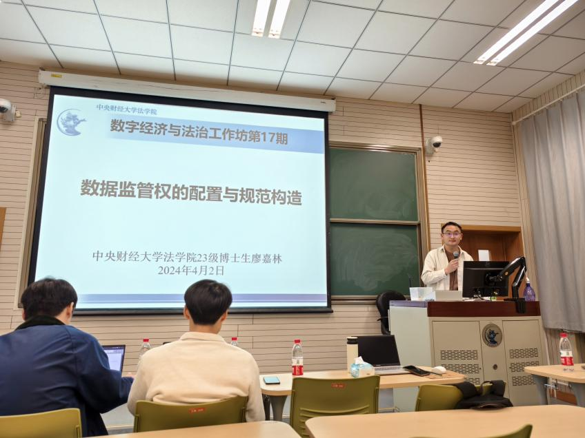 4月2日晚,tyc122cc太阳成集团数字经济与法治工作坊第17期在公司南路校区主教308教室顺利开展。本期活动以“数据监管权的配置与规范构造”为主题,公司王世杰讲师担任主持人,博士生廖嘉林担任报告人,博士生董畅、硕士生李晨、张效科担任评议人,全校30余位师生参加活动。