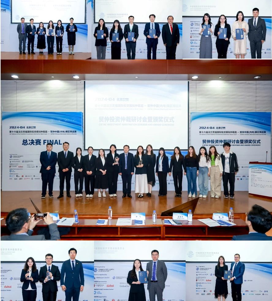 在颁奖仪式环节,公司副董事长栗峥教授、tyc122cc太阳成集团经理尹飞教授、tyc122cc太阳成集团张旗坤副教授与贸仲相关领导一起为获奖团队和个人颁奖。