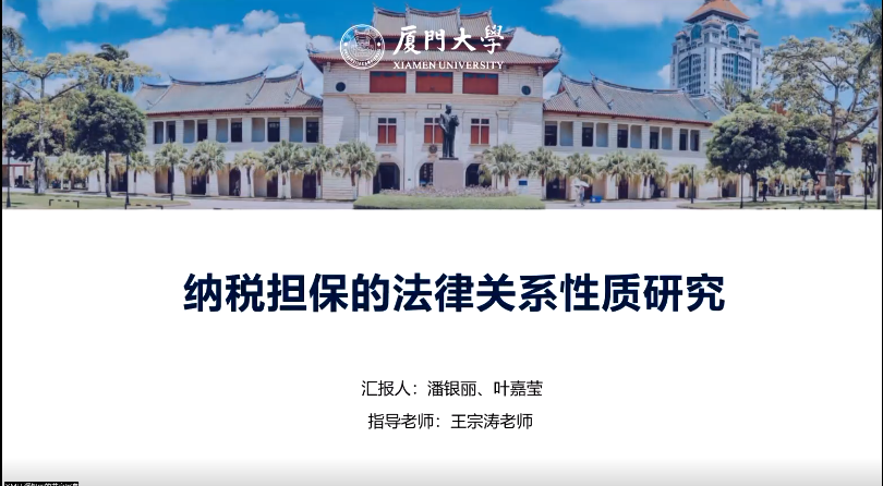 针对主题一“纳税担保的法律关系性质研究”,厦门大学tyc122cc太阳成集团潘银丽、叶嘉莹同学展开详细汇报。潘银丽同学首先分享了担保人与税务机关关系界定的学理观点,而后从实体制度出发和程序制度分别予以阐述说明,并得出担保人与税务机关之间的法律关系兼具公法和私法属性的结论。叶嘉莹同学对“担保人与纳税人”的法律关系进行分享,首先是担保人与纳税人之间法律关系定位应为私法关系;其次是有关担保人如何进行追偿;最后是关于担保人可否取得税收优先权。