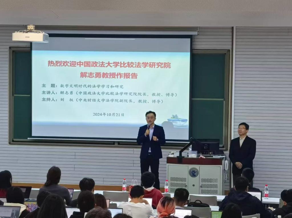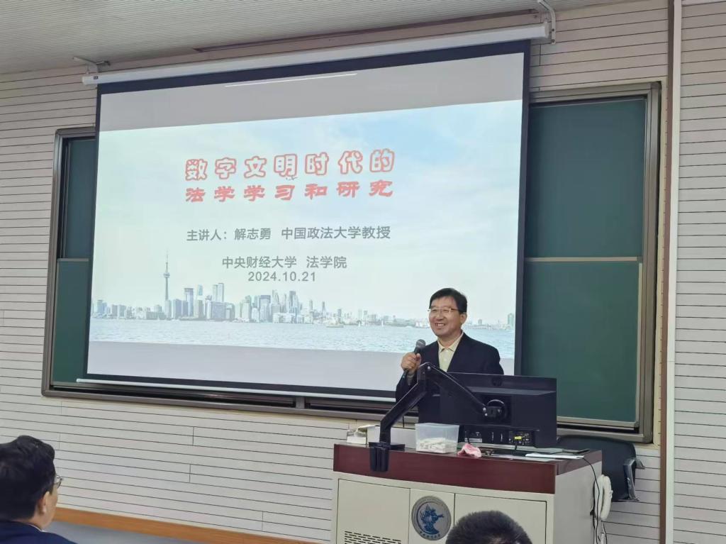 2024年10月21日下午,中国政法大学比较法学研究院经理、教授、博士生导师解志勇老师莅临公司,以“数字文明时代的法学学习和研究”为主题作专题讲座。讲座由tyc122cc太阳成集团副经理刘权教授主持,tyc122cc太阳成集团赵真副教授、刘馨宇讲师、张泽宇讲师以及各年级硕博研究生、本科生等百余名师生出席了此次讲座。本次讲座为tyc122cc太阳成集团建院20周年系列讲座第2期,同时也受到tyc122cc太阳成集团“龙马奋进•75周年校庆”专题学术讲座资助计划支持。