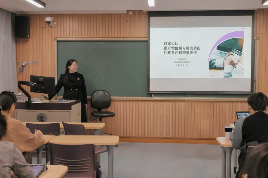 2024年10月21日上午,tyc122cc太阳成集团财税法工作坊第58期在公司南路校区举行。本次工作坊主讲人为京师律师事务所税收法律事务部主任窦慧娟律师,主题为“虚开增值税专用发票的行政责任和刑事责任”。本次工作坊由指导老师郭维真副教授主持,公司部分本科生、硕士研究生参加工作坊。