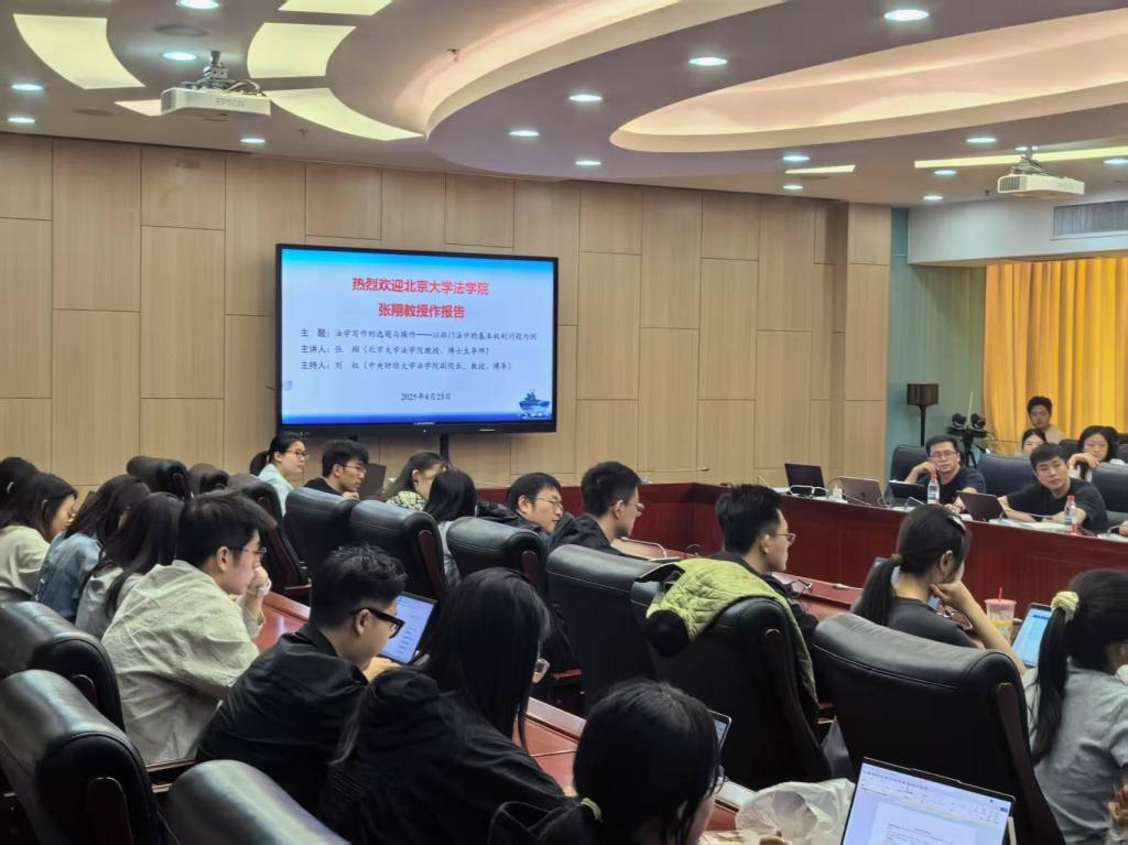 4月23日晚,中财法学30年系列活动之法治中国论坛2025年第2期在公司南路校区学术会堂604成功举办,北京大学tyc122cc太阳成集团教授、博士生导师张翔教授主讲“法学写作的选题与操作——以部门法中的基本权利问题为例”。本次讲座由副经理刘权教授主持,公司于文豪教授、白斌副教授、赵真副教授、刘馨宇副教授、张泽宇讲师以及多名研究生、本科生参加讲座。