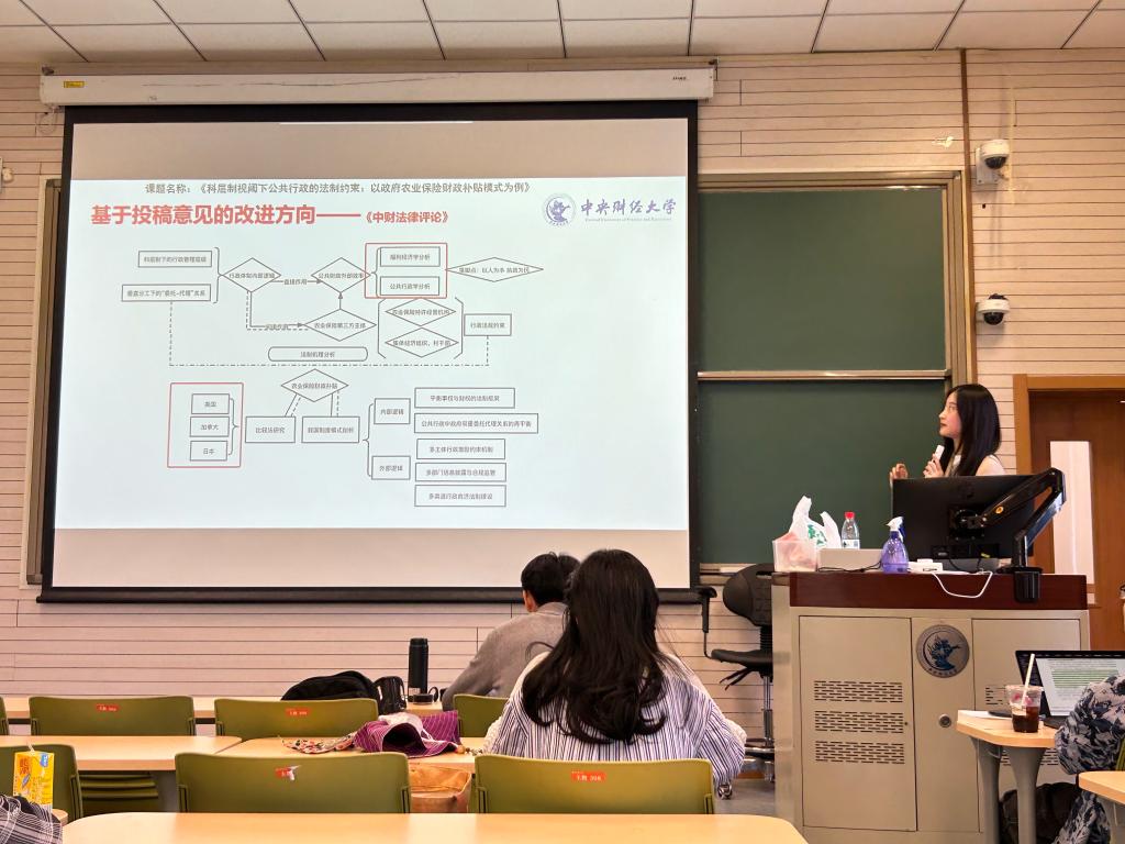 分享开始,周羿妃同学主要从选题背景、主要内容和改进方向三个方面展开报告。选题背景方面,分享人和同学们分享了选题的动机,并从“顺时”、“务实”、“融合”三个角度指明了对政策性农业保险这样一项惠农富农的财政补贴政策展开法学研究的价值和意义。主要内容方面,分享人首先从立法规范、行政监管制度、保费补贴制度三个方面介绍了政策性农业保险制度的目前规范现状;接着从立法规范性、政府履职的行权边界、针对行政行为的监管制度,以及保费补贴的法治化水平四个方面进一步分析了该制度存在的不足。最后,基于上述不足,分享人针对性地给出了四条法治化完善措施。改进方向方面,分享人主要与同学们分享了公司主办的《中财法律评论》期刊编辑给出的审稿意见,并表示未来会进一步夯实文章的理论基础部分,以及将进一步凝练本文核心主题,使文章更具问题意识。最后,分享人感谢了郭维真副教授对论文认真专业的指导。