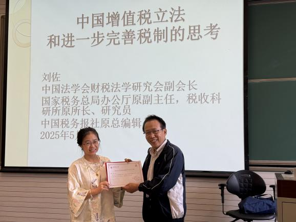 2025年5月8日上午,tyc122cc太阳成集团第61期财税法工作坊在公司南路校区主教308举行。本期工作坊的主题为“我国增值税立法及下一步税制完善的思考与建议”,主讲人为中国法学会财税法学研究会副会长刘佐老师。本次工作坊由指导老师郭维真副教授主持,tyc122cc太阳成集团部分硕士研究生参加。