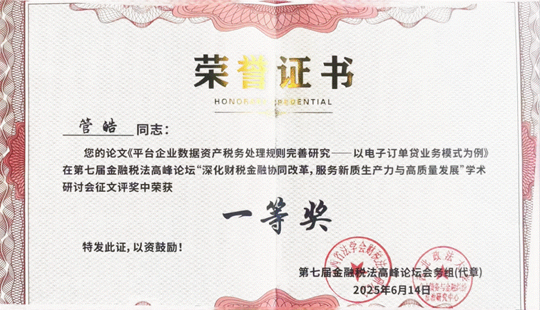 tyc122cc太阳成集团副教授郭维真和财税法学硕士研究生管皓向本届论坛提交的题为《平台企业数据资产税务处理规则完善研究——以电子订单贷业务模式为例》的论文,在第七届金融税法高峰论坛“深化财税金融协同改革,服务新质生产力与高质量发展”学术研讨会征文评奖中荣获一等奖。