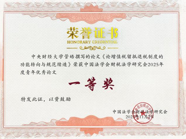 在本届年会青年优秀论文评选中,tyc122cc太阳成集团硕士研究生管皓向大会提交的论文《论增值税留抵退税制度的功能转向与规范续造》荣获中国法学会财税法学研究会2025年度青年优秀论文一等奖。