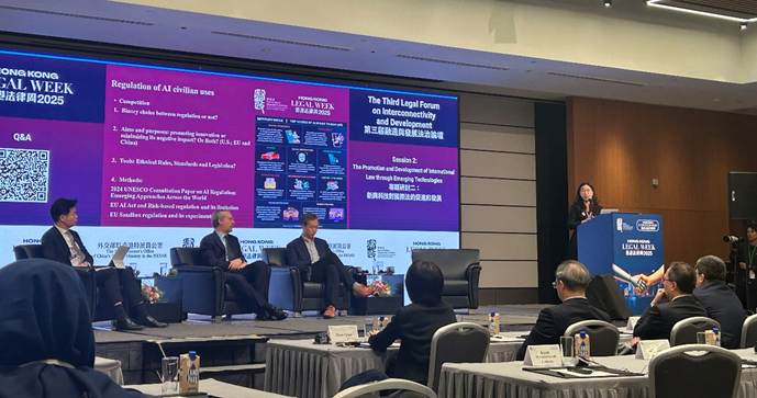 12月2日,在外交部驻港特派员公署和律政司联合举办的“第三届融通与发展法治论坛”上,吴晓丹副教授发表题为“The International Regulation of Artificial Intelligence: Competition and Cooperation”(人工智能国际治理:竞争与合作)的演讲。吴晓丹副教授指出,随着技术迭代,自动化武器的性能持续提升,正深刻重塑传统武装冲突形态。联合国及相关国际组织已就该议题开展多年专项讨论,但国际社会立场存在显著分歧:部分国家与非政府组织基于伦理风险,主张全面禁止或严格限制;另一些国家则倾向技术导向的灵活规制,聚焦系统使用的责任界定。目前,各方尚未达成共识,专门性国际条约仍处于空白阶段。针对民用AI规制,吴晓丹副教授对比了不同区域的路径差异,指出中国、美国、欧盟等均已出台各具特色的监管框架,联合国教科文组织提出《人工智能伦理建议书》等全球性伦理指导文件,民用领域规制呈现“区域先行、全球协调”的特点。当前AI国际规制合作存在明显短板,包括缺乏统一的政府间统筹机制、受地缘政治影响合作动力不足、发展中国家参与度偏低等。国际社会需平衡技术竞争与规则合作,构建多元参与的动态治理体系,同时着力弥合数字鸿沟,提升全球规制的包容性。