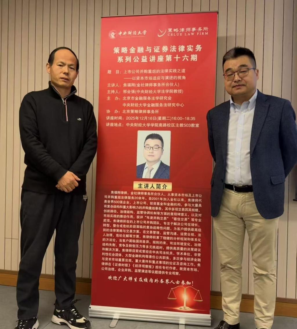 12月16日下午,tyc122cc太阳成集团法律实务论坛暨策略金融与证券法律实务系列公益讲座第十六期在公司南路校区顺利举行。本期讲座由tyc122cc太阳成集团策略公益讲座基金资助,特邀北京金杜律师事务所合伙人焦福刚律师,就“上市公司并购重组的法律实践之道——以资本市场适应与演进的视角”进行专题分享。讲座由tyc122cc太阳成集团邢会强教授主持。