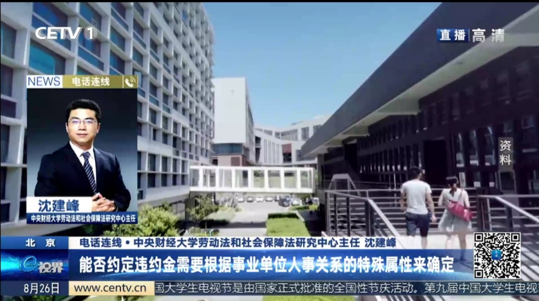 2020年8月26日,沈建峰教授应中国教育电视一台E视界栏目直播连线采访,就最近社会各方关注的某教师与某大学解除聘任合同引发的违约损害赔偿案发表观点。