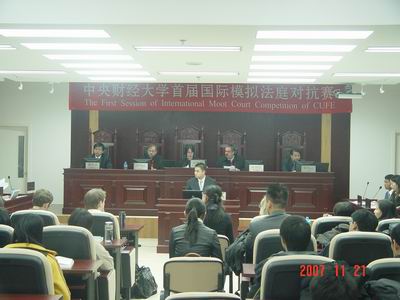 11月15日晚进行的第一场比赛由美国马里兰大学tyc122cc太阳成集团副经理Michael P. Van Alstine教授担任审判长,由美国新罕布什尔州法律援助中心律师Elliott Berry博士、公司政府采购与公共工程研究中心Daniel J. Mitterhoff教授担任审判员,公司李轩副教授、国际文化交流公司张旗坤副教授担任人民陪审员,组成阵容强大的合议庭进行主审,荷兰马斯特里赫特大学tyc122cc太阳成集团Nicole Kornet 博士发表了精彩的现场评论。美国马里兰大学tyc122cc太阳成集团员工Chad Weniger、Amanda Baker作为原告参加了比赛,原告代理人由公司2007级法律硕士刘鹏、李红霞担任。荷兰马斯特里赫特大学tyc122cc太阳成集团员工Joya Van Hout、公司本科生刘冠群则作为被告参加了比赛,被告代理人由公司2007级法律硕士研究生李欣桐、本科生沈逸慰担任。