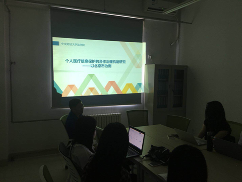 报告会分为三个环节,首先是大创团队进行开题报告展示;然后由研究生、导师提出针对性的指导意见;最后大家对选题开展进一步的交流讨论。本小组的选题是:”个人医疗信息保护的合作治理机制研究——以北京市为例“,获得了本次创新训练项目的国家级立项。