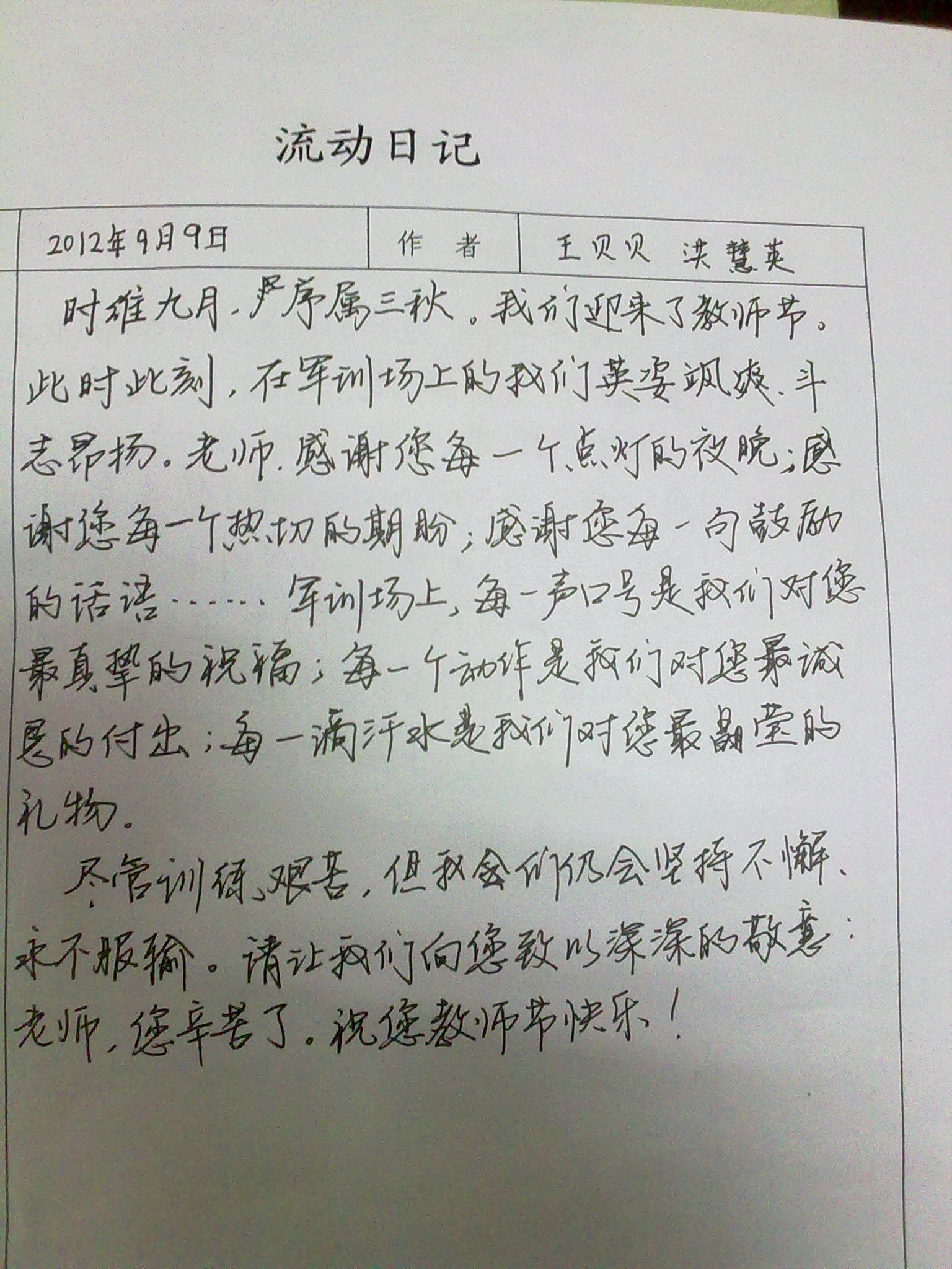转眼间,公司135名2012级本科新生在龙庆峡员工军训基地的训练已经进入了第13天。军营里,再不见员工稚气的脸庞、单薄的身体,取而代之的是标准的军姿,严肃的纪律,坚毅的脸庞。下面,是我们摘取的部分军训学员的流动日记,以此来展示他们在绿色军营中的成长印记。请欣赏┄┄
