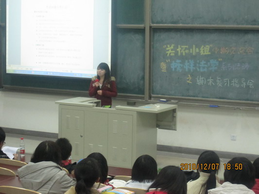 随后,期末复习指导会展开,08级吴云同学、黄慈苗同学根据以往应考经验对09级、10级同学期末复习进行有效指导,他们强调同学们在学习过程中应注意平时积累与考前复习相结合,注重效率,团结互助,争取提高成绩。同时,他们建议同学们珍惜大学时光,尽早规划人生。