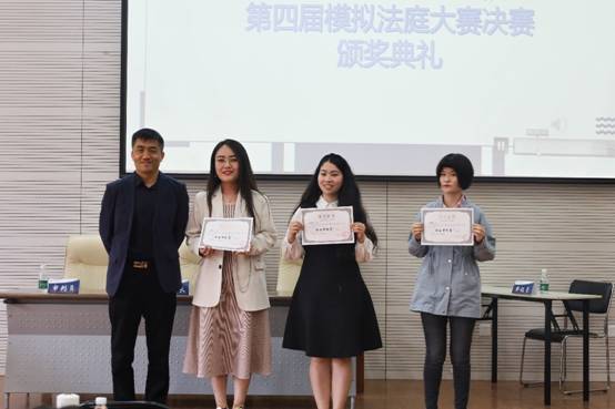 于洪伟副教授为获得”优秀审判员“奖项的马昕宇、权普宇、惠琳琳同学颁发奖状