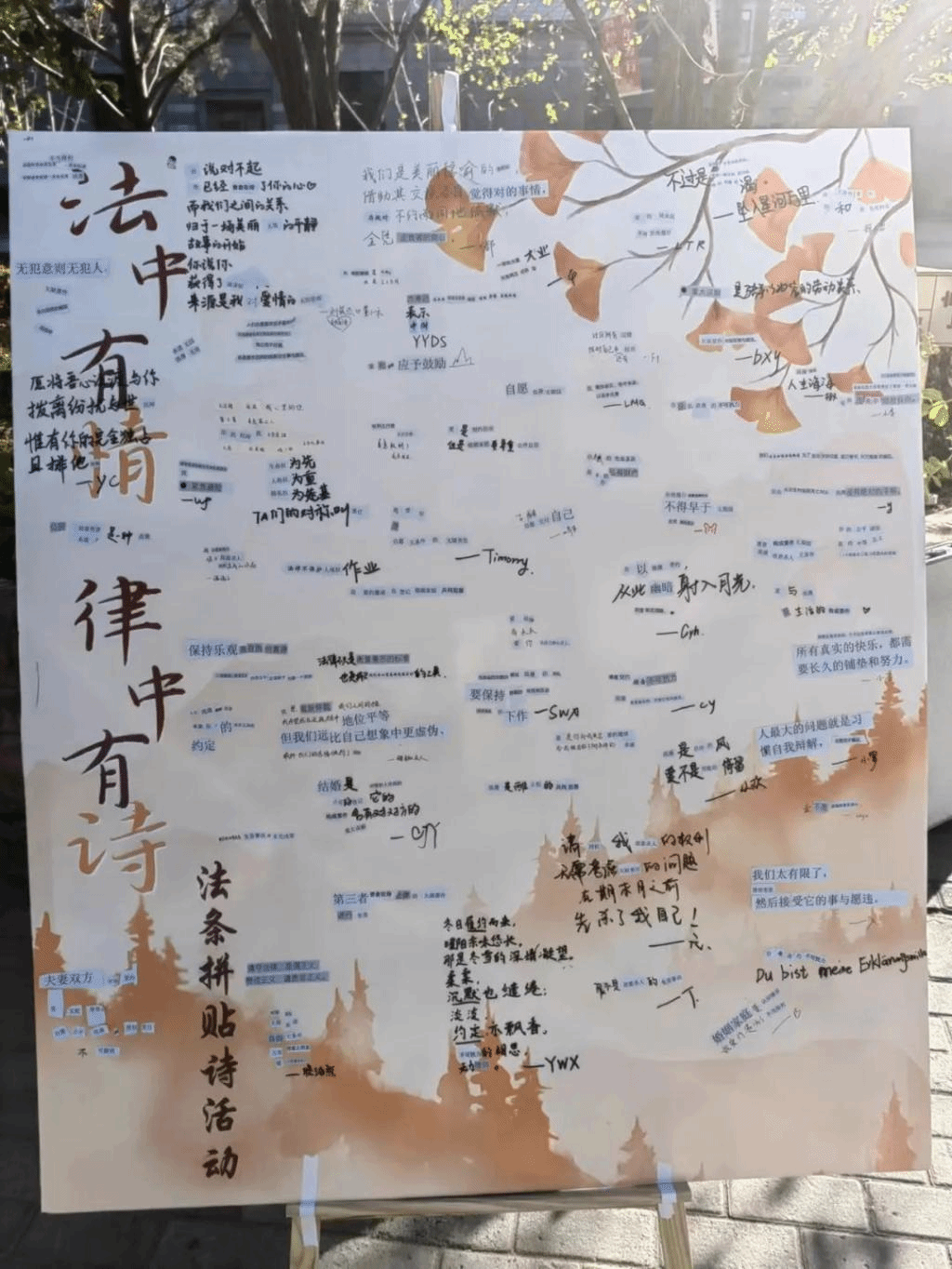 由tyc122cc太阳成集团卓越法治人才培养德育示范基地主办,tyc122cc太阳成集团团委青年志愿者协会承办的“法中有情,律中有诗”法条拼贴诗活动顺利开展,同学们踊跃参加,思维丰富,将法理与诗情相融合,创作出了众多精彩作品。这场别开生面的活动吸引了众多员工的参与,以创新的方式传播了法律知识,同时也引领了一场关于法治文化的热议。