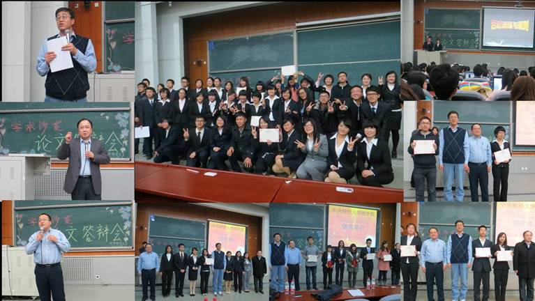 在简明的活动流程与规则介绍后,进入了严肃的答辩环节,九组同学依次上台进行答辩。在论文答辩中,每组选派一名同学简要介绍本组论文,再由全组同学集体在台上接受评委老师的专业提问,并给出自己的回答。场上精彩的一问一答得到了场下观众的阵阵掌声。评委老师有针对性的提问让同学们分析问题更加透彻,也认识到了自己的不足之处。在每三组论文答辩结束后,还穿插了论文知识问答的互动环节,缓解了场上紧张的氛围。