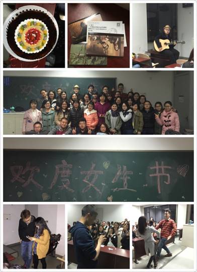 在一轮有趣的热身游戏过后,男生为女生们呈上了美味的节日蛋糕。在分享、品尝美食的同时,多位同学展示了他们各异的才华,让同学们耳目一新、眼前一亮。首先,许致远同学为大家深情地弹唱了歌曲《宠爱》,表达了他对全班女生真诚的祝福;接着,米德同学和阿利亚同学为大家共舞了一段新疆舞蹈,让同学们看到了异域民族的舞姿与风情;然后,陈昊同学表演了拼魔方,他在一分二十秒时间里拼好整个魔方的速度,让全班同学叹为观止;最后,雷浪同学和王桂英同学合唱歌曲《棋子》,作为今天活动的结尾。