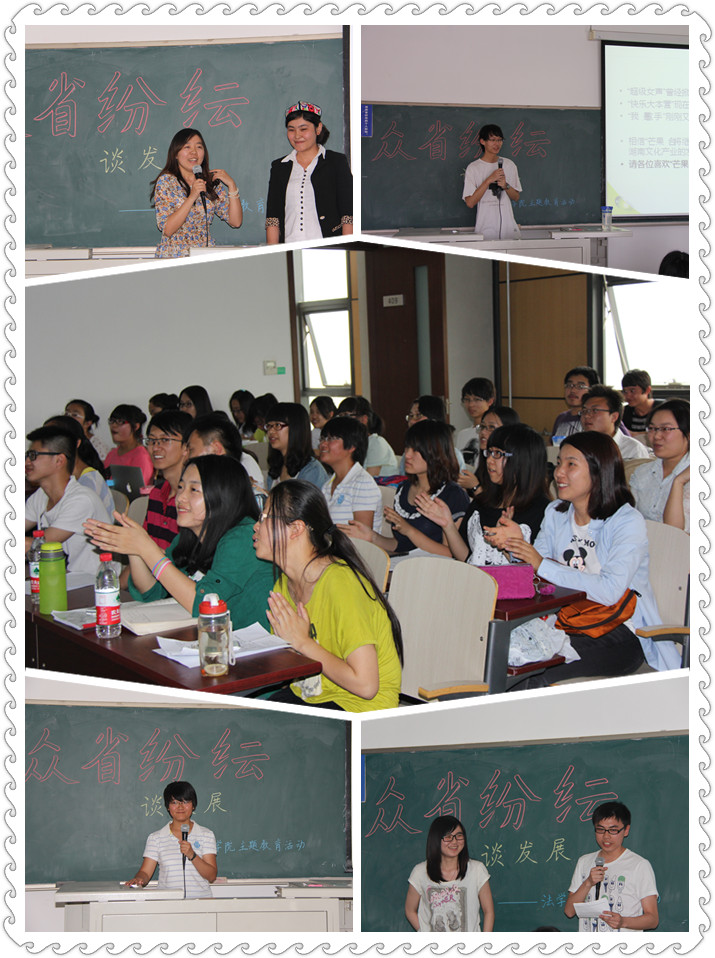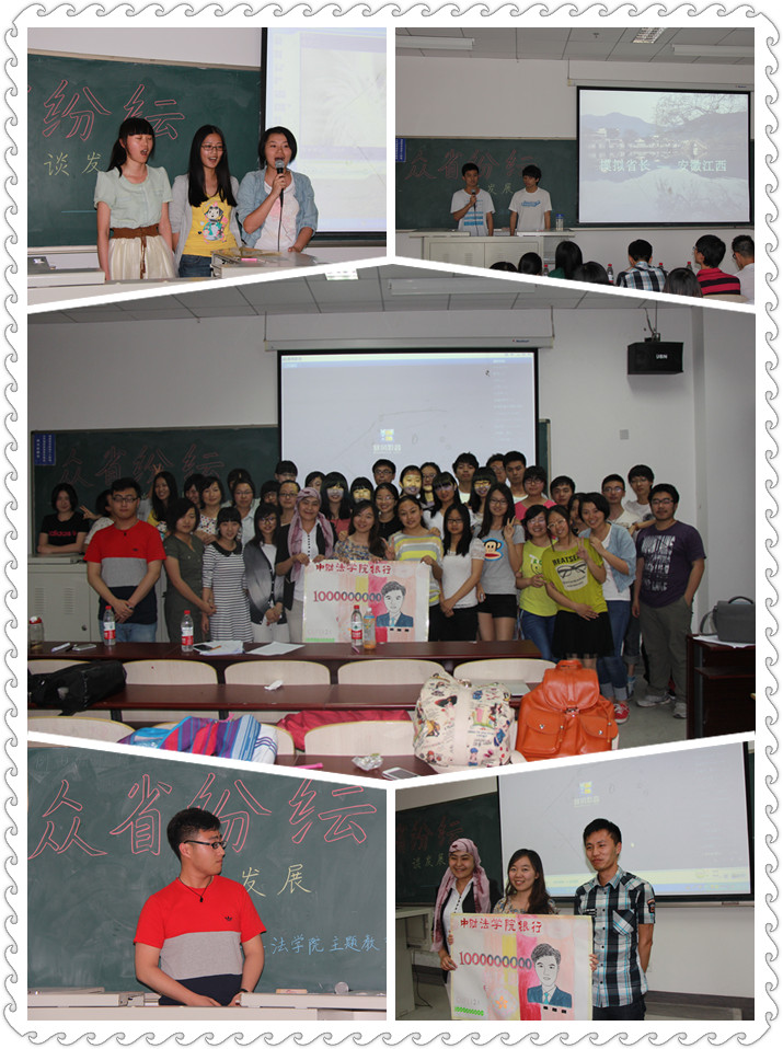 5月21日下午4:30,在主教409举办了2012级法学1班的主题教育活动。本次主题教育的主题为“众省纷纭谈发展”,全班同学以自己的家乡省份作为对象,进行地方特色展示以及介绍,竞争国家的十亿元“拨款”。本次活动由组织部的阙嫣茹同学主持,团总支书记李杰老师,团总支员工会副主席郭栋,法学2011级朱永天、孙秋晓同学为本次主题教育活动担任评委。