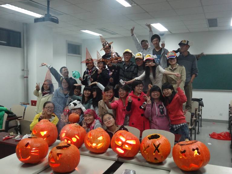六点不到,217教室里是打扮成各种不同造型的同学们:哈利波特、阿拉蕾等,同学们相互拍照纪念,气氛很快就活跃了起来。雕南瓜活动正式开始,心理委员陈芷煊同学介绍了南瓜灯的制作方法和注意事项,接着由心理委员李秋松同学将制作南瓜灯的工具发到事先分好的各小组手中,各小组也很快在万圣节的音乐声中开始了雕刻南瓜活动。同学们照着自己找来的图案来制作自己的南瓜灯,有的是最常见的万圣节南瓜灯图案,有的则找来了小猫小猪的南瓜灯图案,有的还是愤怒的小鸟。雕南瓜不是简单的工作,既需要细致的刀工又需要大家的同心合力的协作,但同学们的兴致高涨,很快大家手里的南瓜灯就初具雏形。当第一盏南瓜灯在同学们的惊呼声中成型后,各个小组的南瓜灯也陆陆续续的完工。点上蜡烛的南瓜灯在关了灯的教室里显得格外的耀眼,让同学们真真正正的感觉到万圣节到来的气氛,大家争先恐后的和自己做的南瓜灯合影留念。各小组的南瓜灯全部完成之后,讲台上所有的南瓜灯一字排开,同学们近两个小时的努力成果都展现在大家眼前。经过评选,冯海年、张凯同学所在组制作的小猪南瓜灯全票当选为全场做得最好的南瓜灯。评选结束之后大家拍了集体照做留念,万圣节活动在八点整圆满落下帷幕。活动结束后,同学们留下来做了清扫工作,将教室打扫干净后有序离开。
