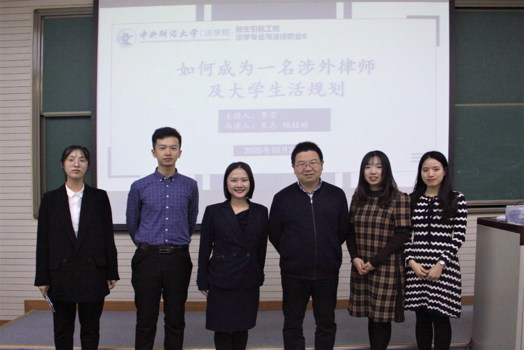 2020年10月26日下午16点50分,公司于公司南路校区主教学楼104教室举办2020级本科生“法学专业与法律职业”课程暨新生引航工程讲座。本次“如何成为一名涉外律师及老员工活规划”主题讲座由目前就职于高伟绅律师事务所的2012届本科生覃莹主讲,2019届本科生朱志、2020届本科生陆桂婷和17级本科生刘兴淼与谈。本场讲座由20级本科生陈莉主持, 2020级全体本科生参加。
